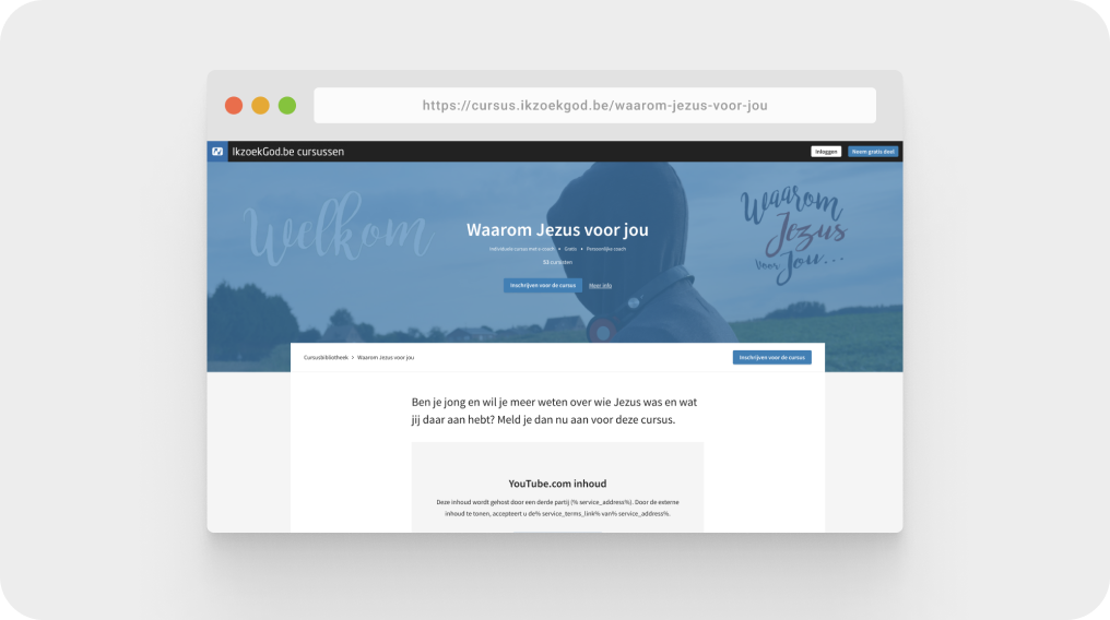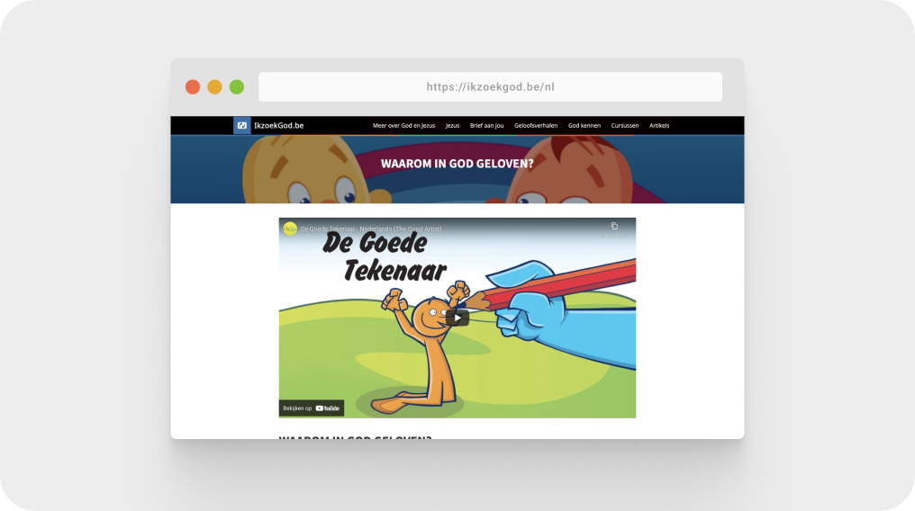 https://ikzoekgod.be/Deze website biedt allerlei artikelen over het geloof en ook verschillende online cursussen aan die je helpen in je zoektocht naar God. Bij een aantal van de cursussen word je ondersteund door een persoonlijke e-coach aan wie je al je vragen kunt stellen. Er zijn ook cursussen die je zonder begeleiding kunt volgen.