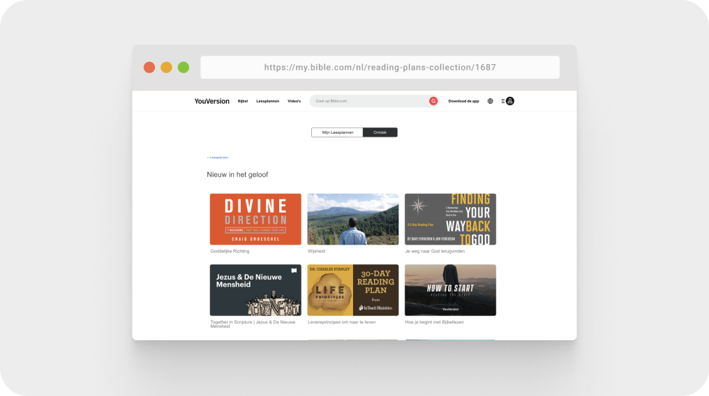 https://my.bible.com/nlHier kun je kiezen uit verschillende korte en langere leesplannen die je op je eigen ritme kan afwerken.